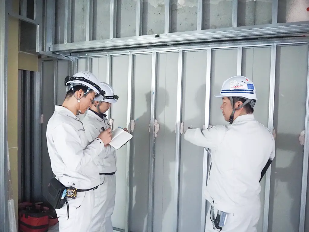 鋼製下地・ボード工事を軸に、SQ工法や木造耐火工事など専門性の高い技術を学べる環境があります。