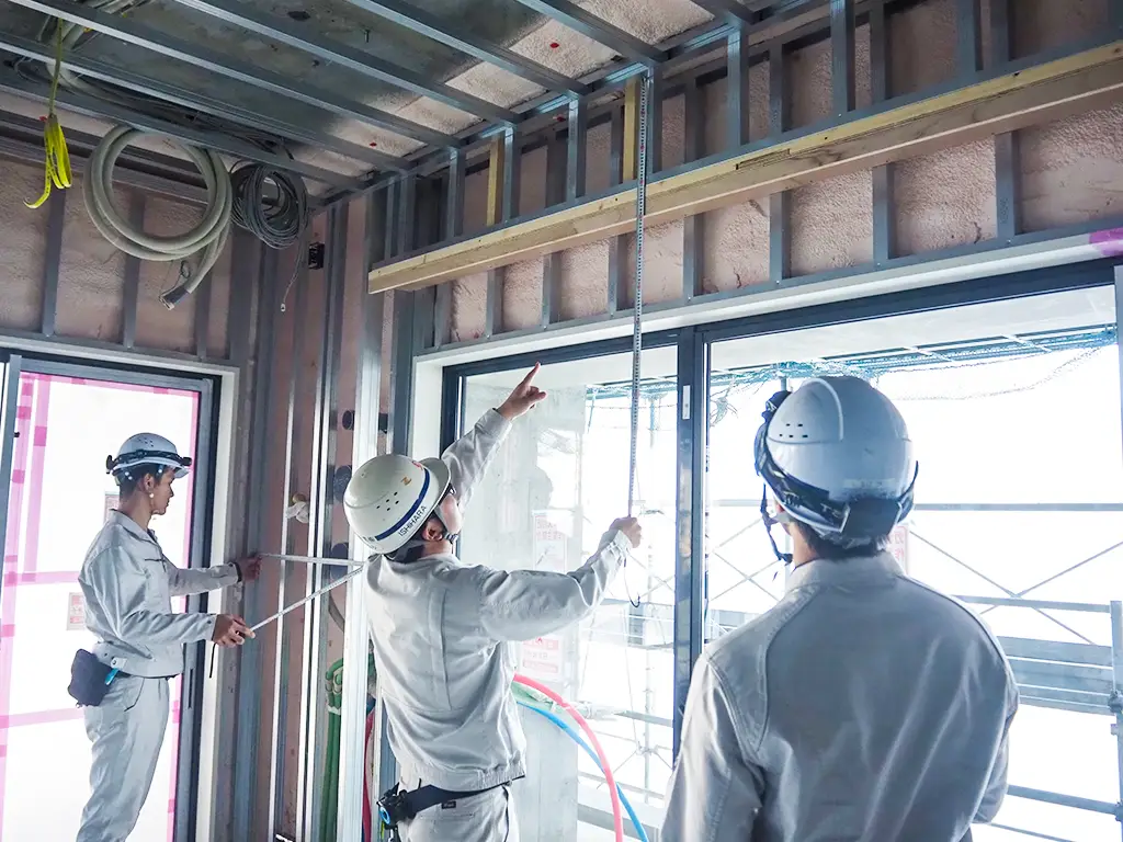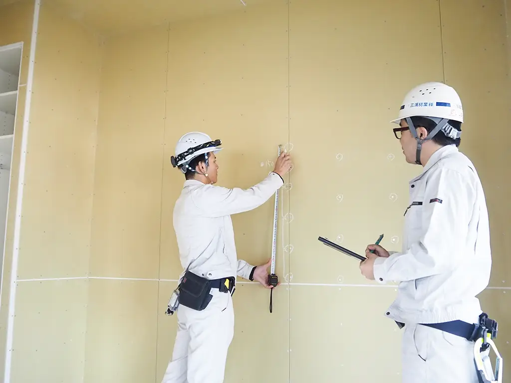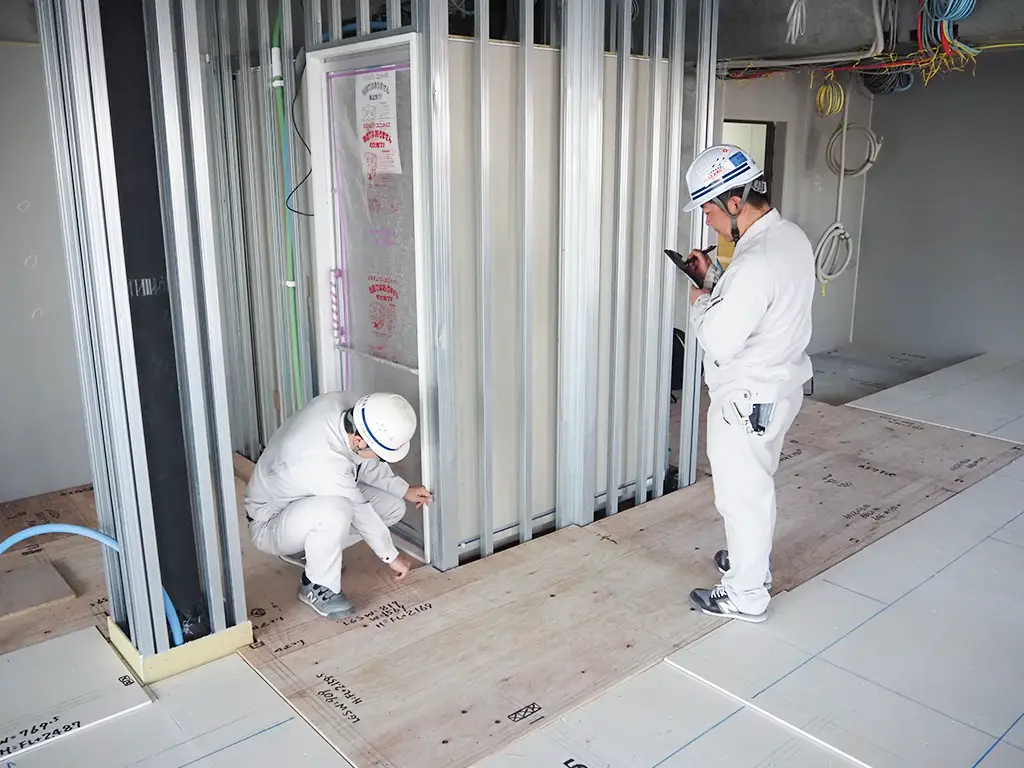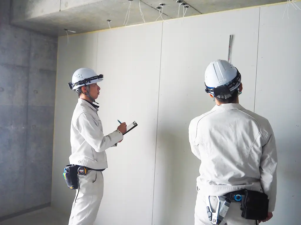 墨出し工事は、すべての内装工事の基準となる、非常に重要な工程です。当社では、専用部・共用部を問わず、設計図面を正確に読み取り、後工程を見据えた墨出しを行っています。現場条件や施工順序を考慮しながら、次工程がスムーズに進むよう配慮した墨出しを行い、品質の高い内装づくりの土台を支えます。